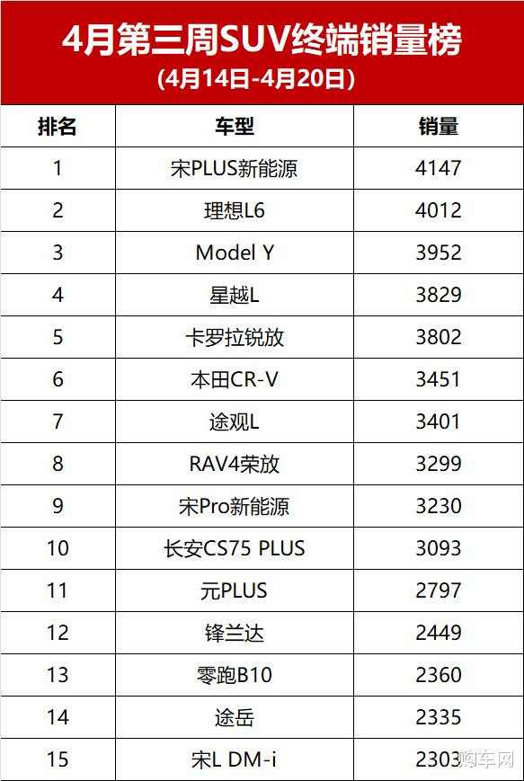 整体而言,2025年4月第三周的SUV终端销量排名,反映出当下汽车市场呈现多元化竞争态势。新能源车型持续发力,传统燃油车也在积极寻求突破,各品牌在不同细分市场各展所长。随着市场不断发展,消费者将有更多优质SUV车型可供挑选,而车企们也需持续创新、提升产品竞争力,以在激烈的市场竞争中抢占先机。