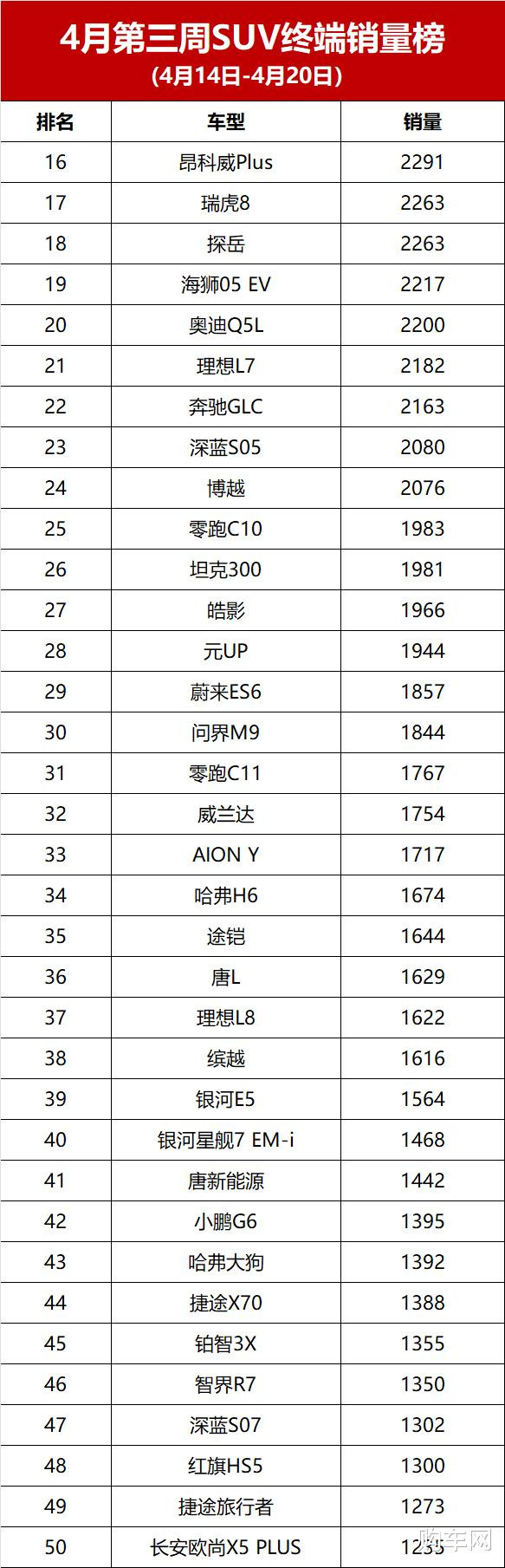 【2025年4月第三周SUV终端销量榜】上海车展前夕,国内SUV市场继续保持增长势头。据近日公布的最新销量数据显示,4月第三周(4月14-20日,2025年第16周)国内SUV市场终端销量前五十车型合计销量达到11.0万辆,环比上周增长14.2%,部分车型的销量排名也出现了较大变化。