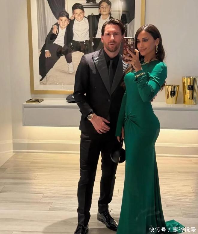 梅西的妻子安东内拉一袭墨绿色礼服惊艳亮相,独特的剪裁和精致的细节设计,完美地勾勒出她的身材曲线,举手投足间散发着优雅与自信,成为现场一道亮丽的风景线。